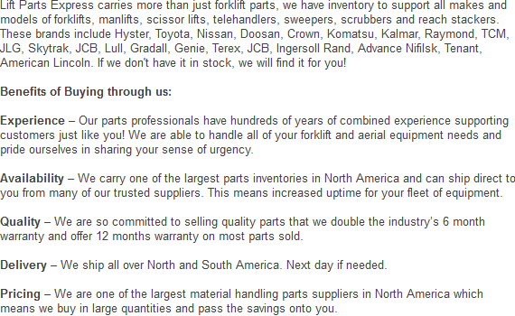 For your entire fleet of lift-trucks, we provide the best prices on all our parts. For a price estimate on a part or attachment we offer, please get in touch with us at: